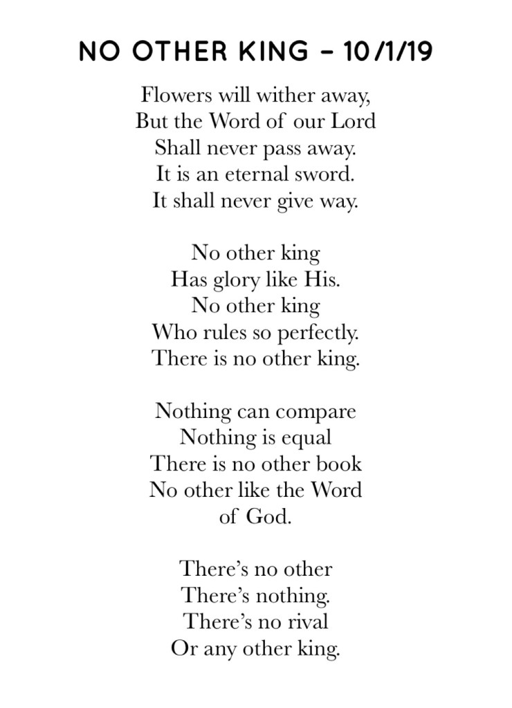 There is no other king who is like our God. All earthly kings will die one day and will be judged, but our King IS the judge! He has everlasting, never ending, sovereign power! He is King of kings and there is none like him.